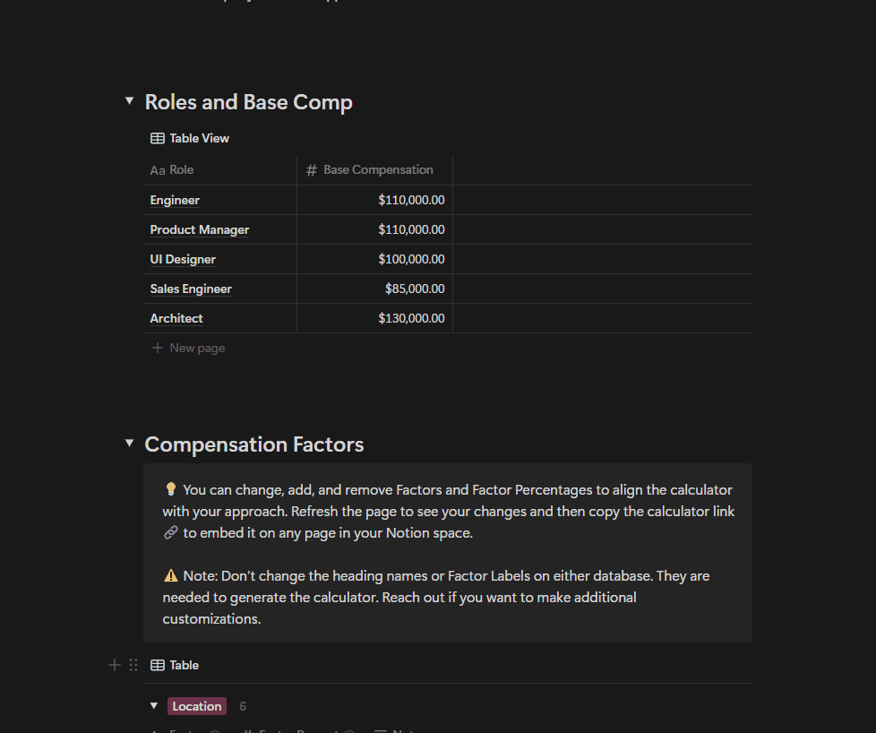 This is a configurable compensation calculator linked to two Notion databases. The first database records roles and base compensation rates, while the second database captures factors such as location, levels, and steps. Once configured, the databases are used to generate a compensation calculator that can be embedded in any page across Notion.